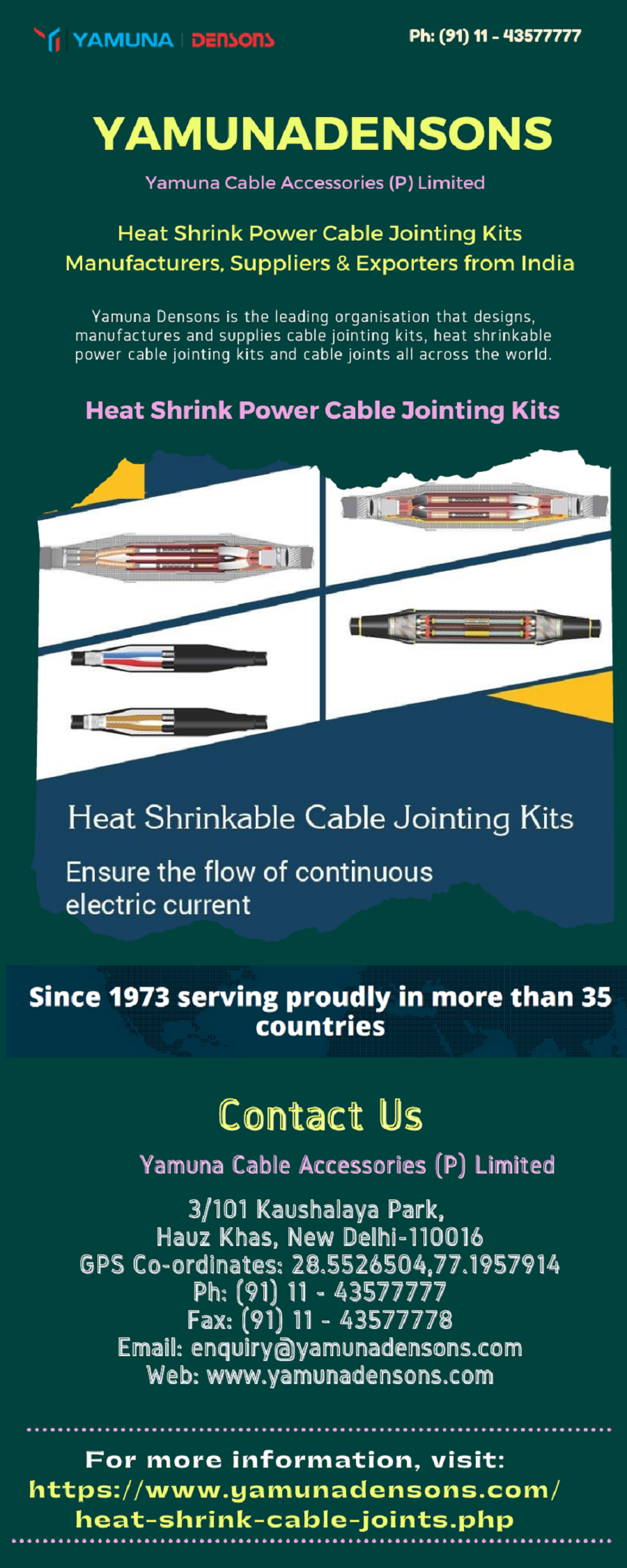 Yamuna Densons is one of the most trusted power cable jointing kits manufacturers, suppliers & exporters from India. We also manufacture and supply power cable joints, cable joint kits, which are used in cable joints for XLPE/PVC/PILC cables, both for low voltage and medium voltage. For more information, visit: https://www.yamunadensons.com/heat-shrink-cable-joints.php